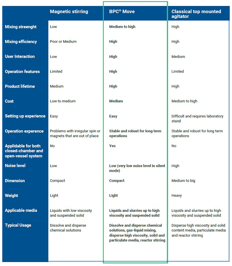 BPC Move는 정밀하게 제어된 교반으로 일반 모드와 무소음 모드에서 작동을 제공합니다. 회전 속도가 1~600RPM에 이르므로 대부분 유형의 교반 응용 분야에서 요구하는 사항을 충족할 수 있습니다. 무소음 모드에서 BPC Move는 작동 소음을 줄여 1~220RPM의 혼합을 제공합니다. 또한 BPC Move는 교대 교반, 간헐적 교반, 사용자 정의 사이클 등 다양한 다른 모드를 제공합니다.